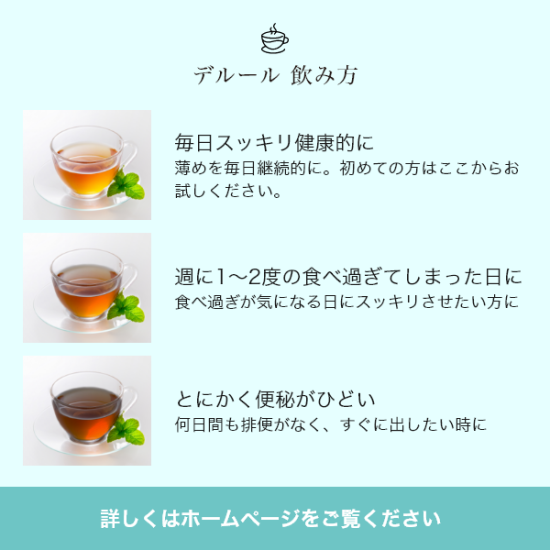 58種類の天然ハーブ配合のダイエットティー デルール プラスの、目的別での濃さの目安とご注意点をご紹介します。